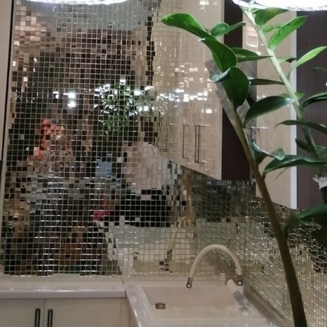 Использована квадратная серебристая зеркальная плитка размером 18х18.